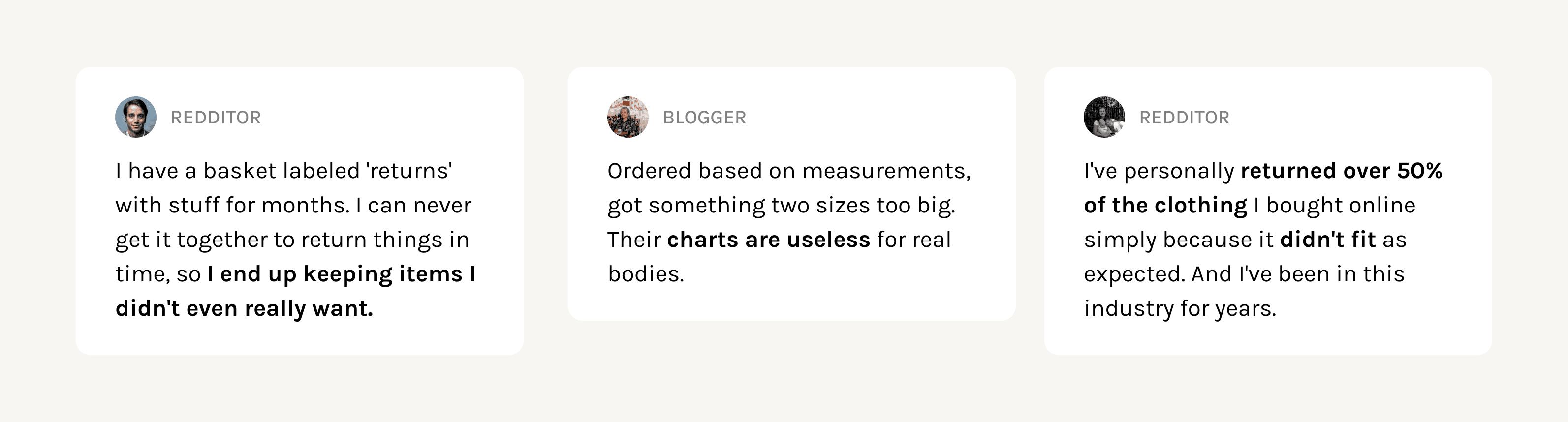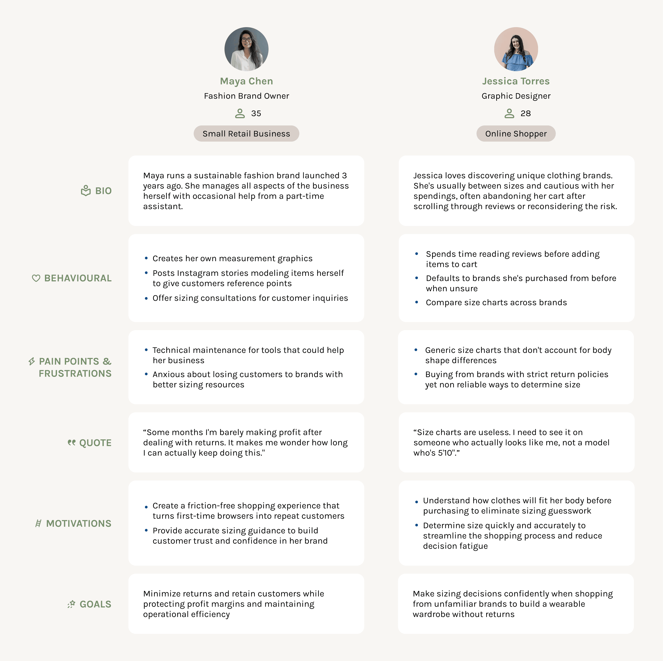 Small online retailers need to reduce return rates but lack affordable tools to help customers choose the correct size, resulting in financial and operational strain. | Online Shoppers need reliable sizing to buy from new brands, but retailers provide inadequate fit guidance, leading them to take costly risks or stick with familiar options. |