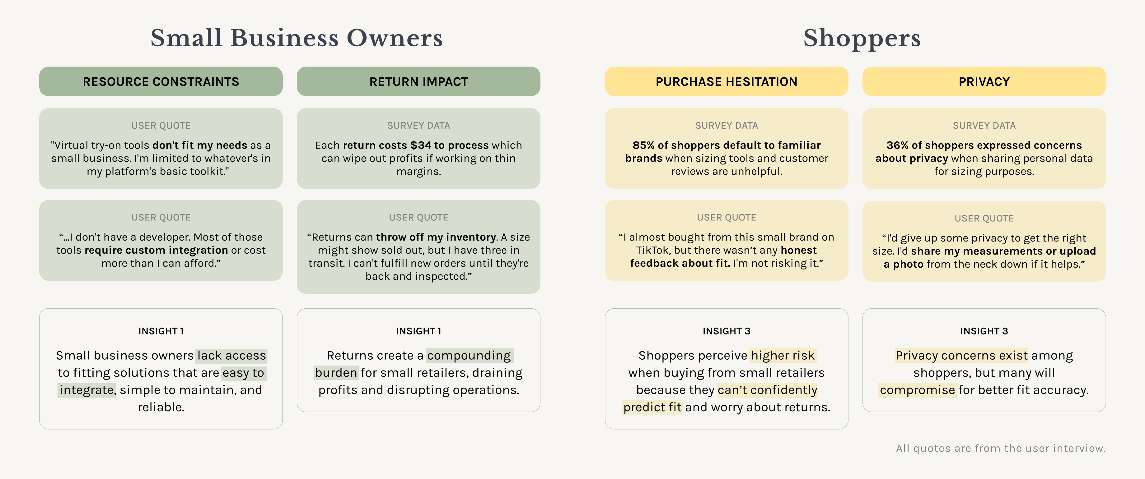 We conducted 10 interviews with small retailer owners and surveyed 100+ shoppers to gather the data.